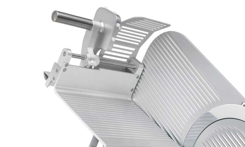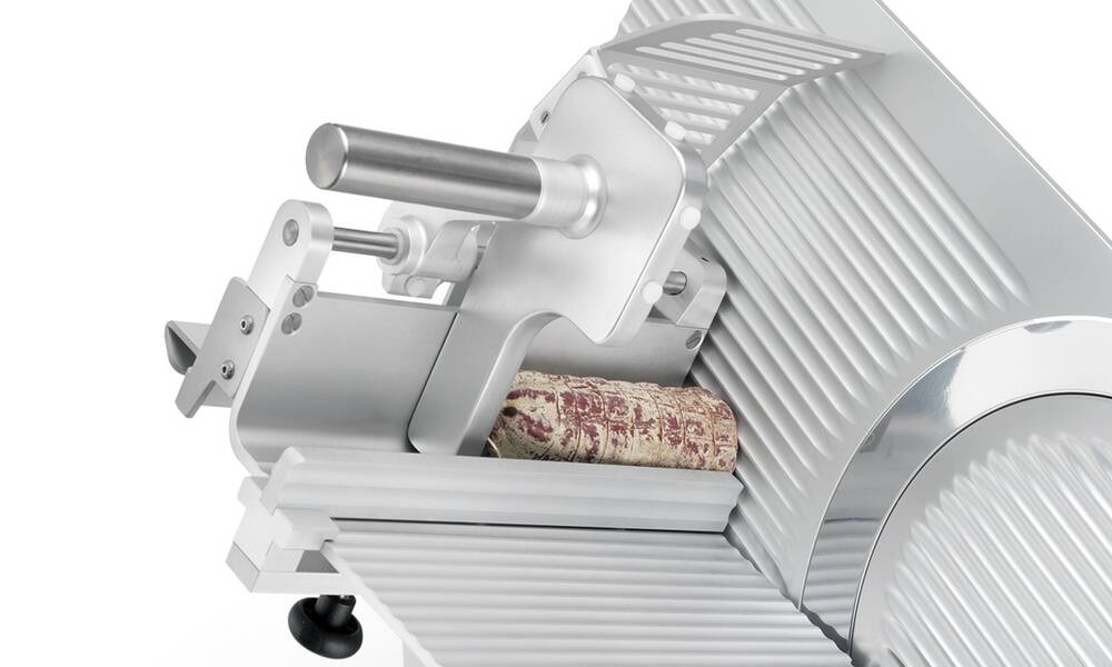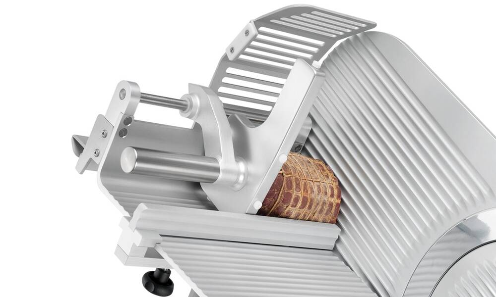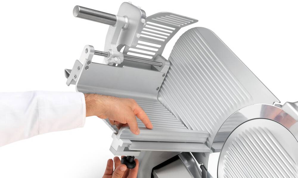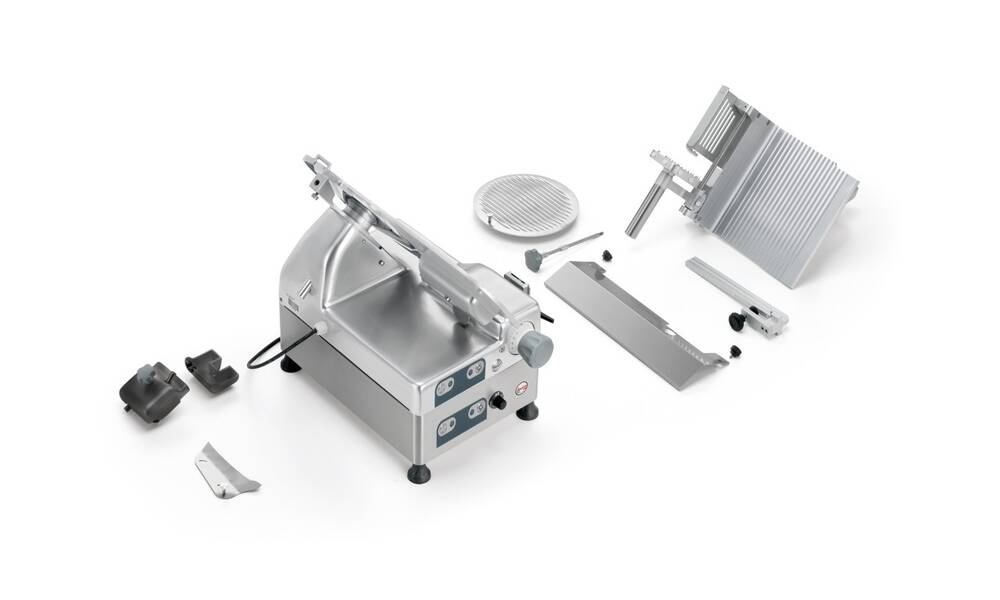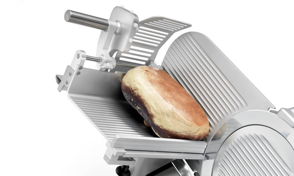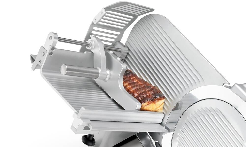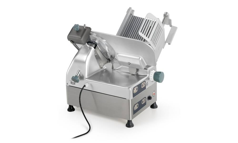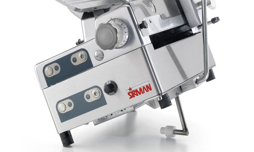 Nářezový stroj CANOVA 300 AUTOMEC s nerezovým nožem o průměru 300 mm s uložením posuvného stolu našikmo, od itaslkého výrobce SIRMAN.
