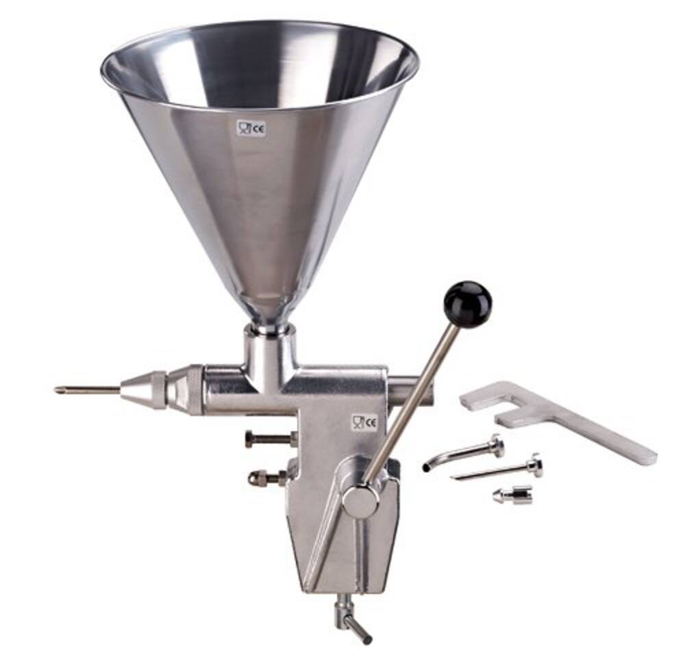 Tělo plničky: hliník; trychtýř,válec,píst,vstřikovací tryska,páka a výtlačné žebro: nerez ocel. Průměr pístu: 2,4cm. Dávka: 1–30g